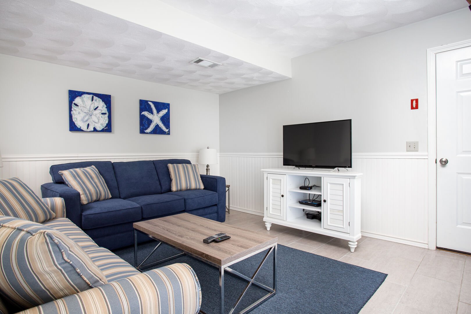 • A main level den/TV room with two sofas (one is a queen sleeper sofa), custom closet, and flat screen TV.