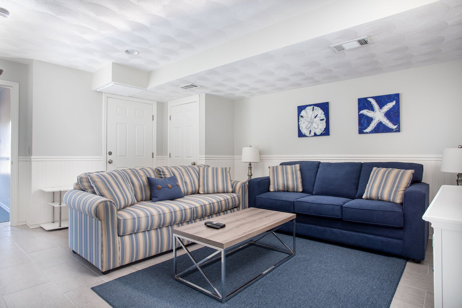 • A main level den/TV room with two sofas (one is a queen sleeper sofa), custom closet, and flat screen TV.