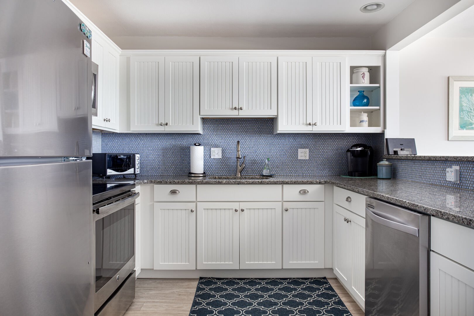 • A fully stocked designer kitchen with custom cabinetry, granite countertops, and stainless steel appliances.