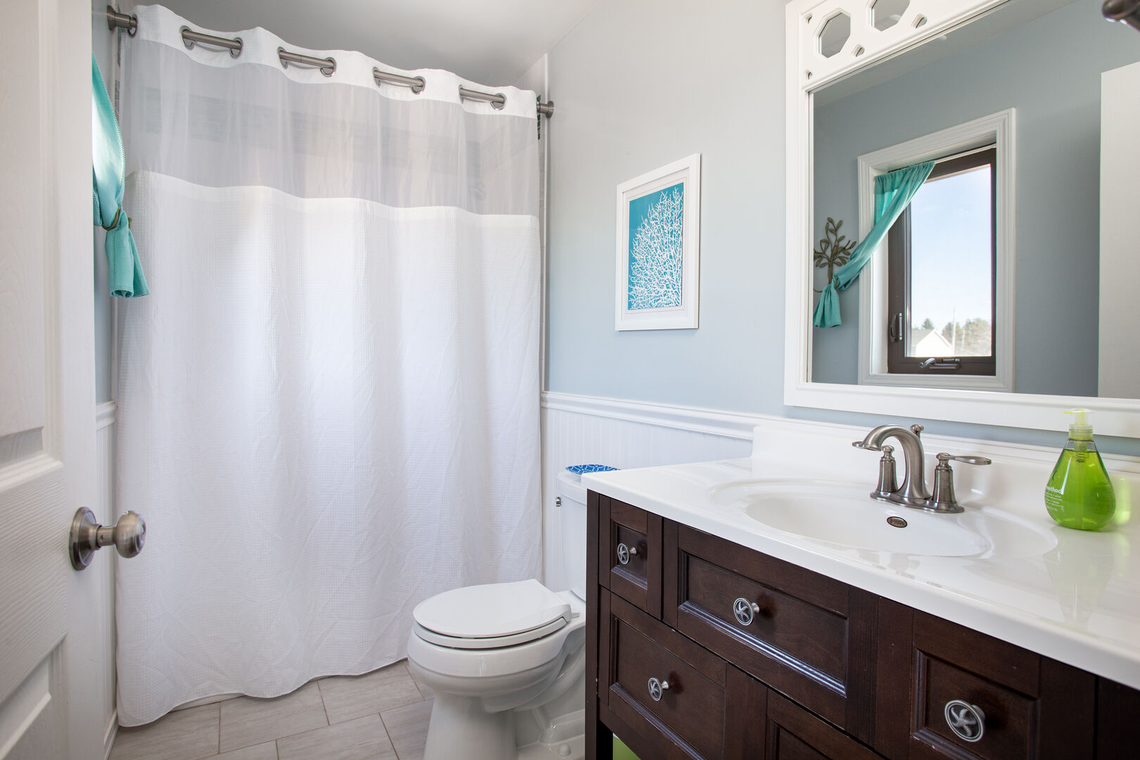 • Two full bathrooms, beautifully tiled with cast iron tubs, showers, and modern vanities.
