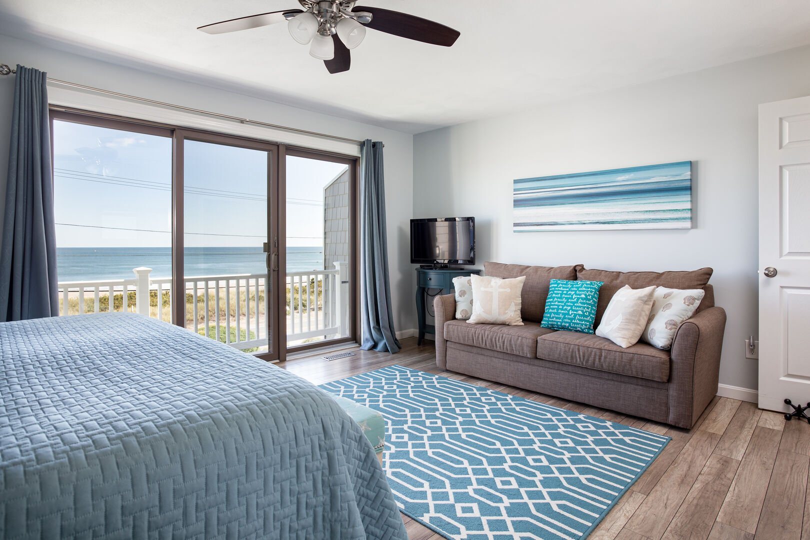 • A king bedroom with a private ocean view deck, (plus a queen sleeper sofa), custom closet, and flat screen TV.